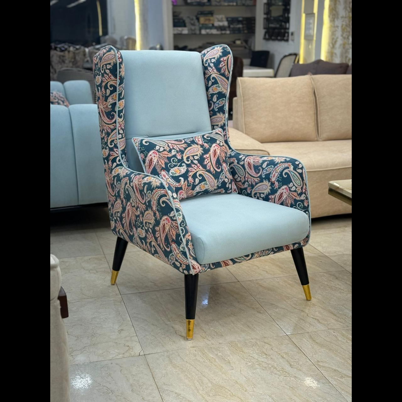 Crafted with a strong internal frame, this designer armchair ensures durability and long-lasting stability. The premium upholstery fabric is carefully selected for its softness, durability, and refined texture, ensuring the chair maintains its elegant appearance over time. The contrast between the smooth seat fabric and the printed upholstery creates depth and character, making this piece a standout element in any room.