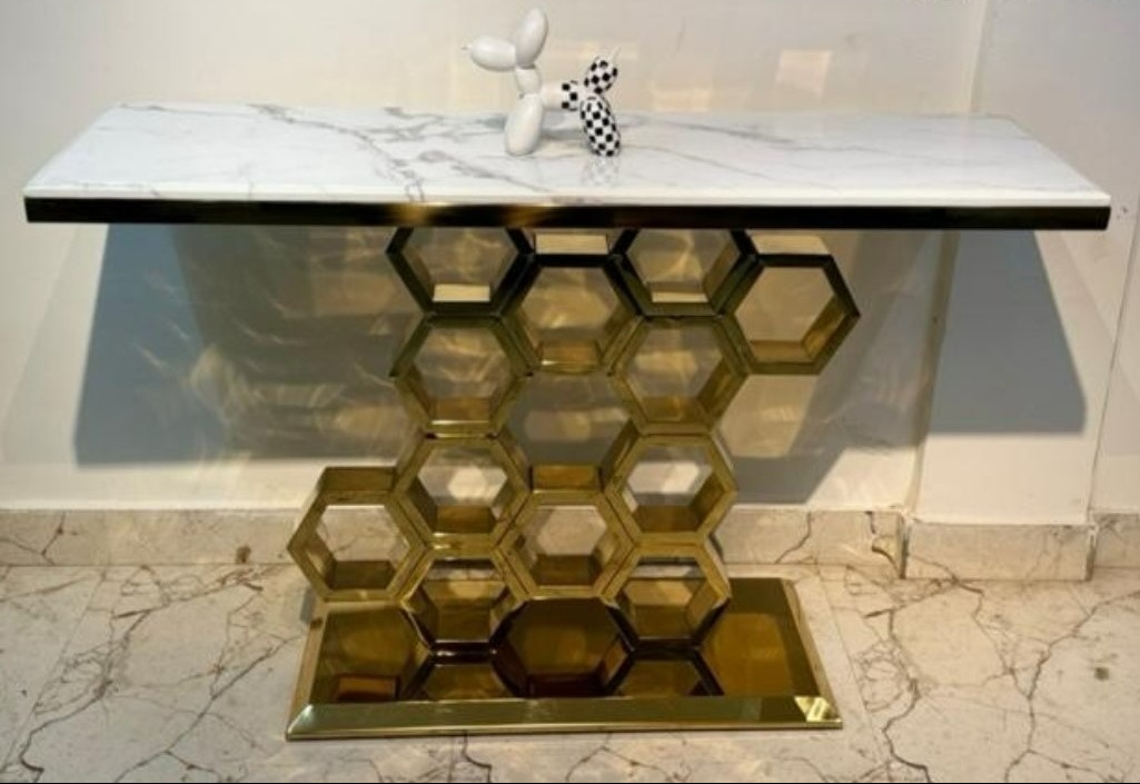 Elevate your interior décor with this stunning Luxury Honeycomb Golden Base Console Table, designed to redefine elegance and modern luxury. Featuring an exquisitely polished white marble tabletop paired with a striking geometric honeycomb design base in gold stainless steel, this premium console table brings a perfect blend of artistic craftsmanship and contemporary sophistication. The luxurious white marble top showcases natural veining patterns that enhance its premium appeal, while the hexagonal golden structure adds an architectural character, making it a true statement piece for any space. Ideal for hallways, entrances, lobbies, drawing rooms, living rooms, showrooms, hotel receptions, and décor corners, this masterpiece stands out as both a functional table and a sculptural décor element. Its durable stainless-steel base ensures rust resistance, strength, and long-lasting shine, making it perfect for everyday use while maintaining a high-end aesthetic.This designer console table is crafted for modern interiors that love simplicity with sophistication. The honeycomb base symbolizes luxury, unity, and modern geometric beauty—instantly transforming any space into a premium-looking environment. Whether styled with vases, sculptures, lamps, decorative artifacts, or floral arrangements, it enhances the ambience effortlessly. The rectangular white marble top provides ample display space while keeping the look sleek, minimal, and chic. Perfect for contemporary, classic, modern luxury, Scandinavian, and hotel-style interiors, this console table complements every décor theme beautifully.If you are looking for a console table near me in Delhi, this exclusive designer piece is available in Kirti Nagar Furniture Market, Delhi, famous for luxury home furniture. Bring home the perfect balance of functionality, art, and luxury and leave a lasting impression on every guest who walks in. Its presence instantly uplifts entrance foyers, living spaces, and walkways by adding a rich, glamorous aura. Designed for homeowners, interior designers, architects, and luxury furniture lovers, this table is ideal for upscale homes, villas, offices, boutiques, salons, cafés, resorts, and private lounges. It also makes a premium gifting choice for weddings, housewarming events, anniversaries, and interior décor upgrades.