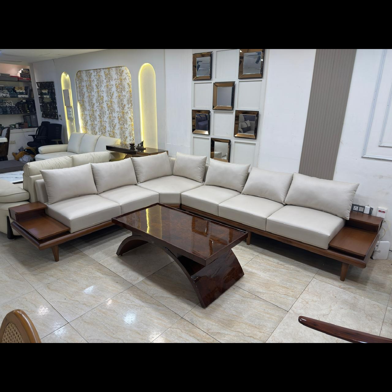 Transform your living space into a statement of elegance and comfort with this Luxury L-Shape Wooden Sofa Set, designed for modern homes that value style, durability, and superior craftsmanship. Perfectly blending contemporary aesthetics with timeless wooden detailing, this sofa set is an ideal choice for premium interiors, spacious living rooms, and designer homes. Crafted with a solid wooden base and finished with high-quality upholstery, this L-shaped sofa offers exceptional comfort while enhancing the visual appeal of your home. Its clean lines, neutral colour palette, and sophisticated design make it suitable for both modern and luxury interior themes. This luxury L-shape wooden sofa set is designed to bring together refined aesthetics, superior comfort, and long-lasting craftsmanship for modern living spaces. Built with a strong solid wooden base and finished with premium upholstery, this sofa set reflects elegance and durability in equal measure. The sophisticated design makes it an ideal centrepiece for luxury living rooms, contemporary homes, and designer interiors. Its clean lines and balanced proportions create a timeless appeal that blends seamlessly with both modern and classic décor styles. The L-shape configuration offers generous seating space while making efficient use of corner areas, making it perfect for spacious living rooms as well as well-planned modern homes. The extended seating layout allows family members and guests to relax comfortably, whether for everyday use or special gatherings. The sofa’s structure is carefully designed to provide excellent support while maintaining a sleek and uncluttered look that enhances the overall ambiance of the room. Crafted using high-quality wood, this luxury sofa set ensures strength, stability, and long-term durability. The polished wooden base adds a warm, natural touch that enhances the richness of the design and complements premium interior themes. The expert craftsmanship is visible in every detail, from the smooth finish of the wooden frame to the precise alignment of the seating modules, ensuring both visual appeal and structural integrity. The upholstery used in this designer L-shape sofa is selected for its softness, resilience, and premium feel. The cushions provide a perfect balance of comfort and support, allowing you to enjoy long hours of relaxed seating without discomfort. The neutral upholstery tone enhances the elegance of the sofa while making it easy to pair with a wide range of wall colours, flooring styles, rugs, and décor elements. This versatility makes it suitable for modern apartments, luxury villas, and high-end residential projects. This luxury wooden sofa set is designed to elevate the experience of everyday living. Whether you are entertaining guests, spending time with family, or relaxing after a long day, the spacious seating arrangement offers unmatched comfort and functionality. The ergonomic design supports proper posture while the wide seating area encourages relaxation, making it an excellent choice for both social and personal spaces. The modern yet timeless design of this L-shape sofa makes it a valuable addition to any contemporary interior. It pairs beautifully with wooden or marble centre tables, ambient lighting, and minimalist décor themes. The refined appearance of the sofa enhances the visual depth of the living room while maintaining a clean and luxurious look that never feels overpowering. Durability and easy maintenance are key features of this premium sofa set. The upholstery fabric is designed for regular use and is easy to clean, making it suitable for modern households. The wooden base is treated with a high-quality finish that protects it from daily wear while preserving its polished appearance for years to come. With minimal care, this sofa maintains its elegance and comfort over time.