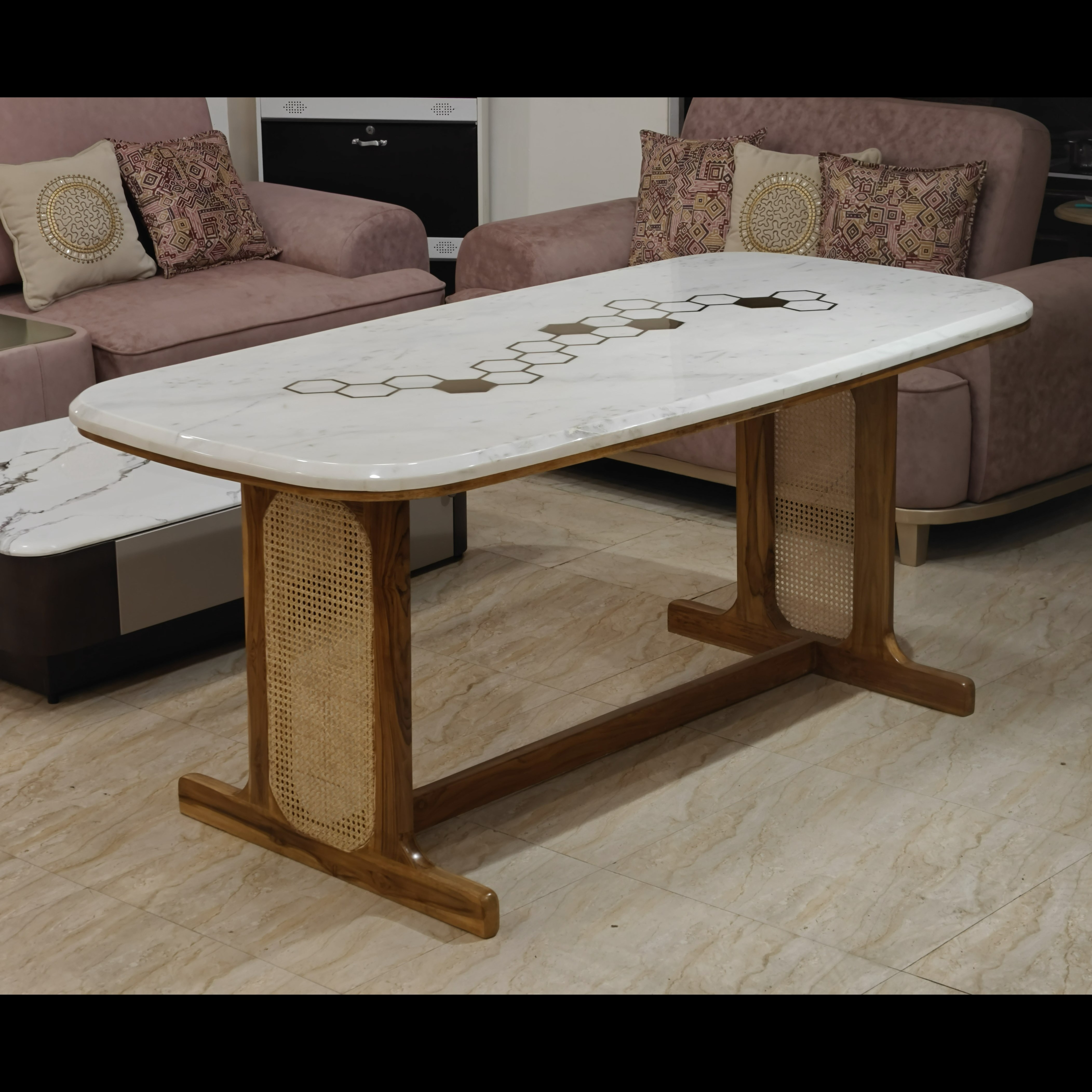 Introduce timeless luxury into your dining space with this designer marble top dining table featuring a solid wood and cane base, a perfect fusion of elegance, craftsmanship, and modern functionality. Available in Kirti Nagar, Delhi, this premium dining table is ideal for those searching for luxury dining tables near me that offer both visual impact and lasting durability.