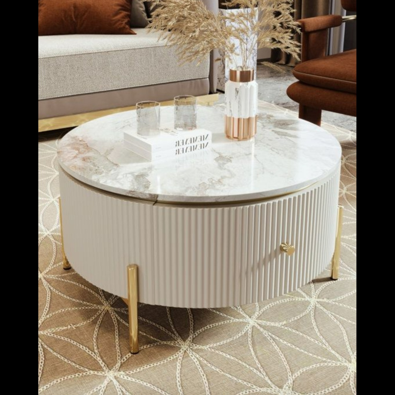 The beautifully crafted circular body features a ribbed fluted design in an elegant matte cream finish, adding a modern architectural touch that blends seamlessly with luxury décor themes. What sets this center table apart is its built-in storage — a hidden compartment accessible through a smooth pull-out door with a gold handle. This smart functional storage space helps keep remote controls, coasters, magazines, accessories, snacks, candles, or décor items organized and out of sight, providing a clutter-free living environment. This makes the coffee table both visually stunning and highly practical for modern homes.